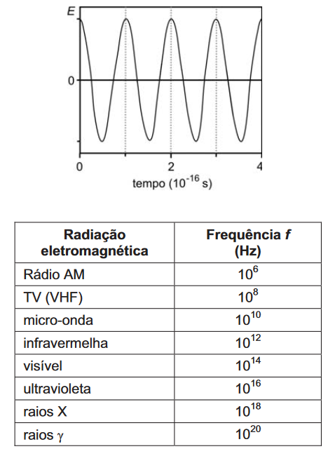 Consultando a tabela acima, que fornece os valores típicos de frequência f para diferentes regiões do espectro eletromagnético, e analisando o gráfico de E em função do tempo, é possível classificar essa radiação como