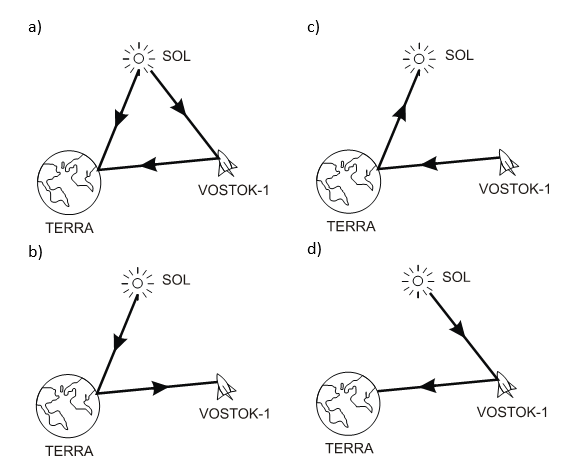 Assinale a alternativa em que estão corretamente representados os trajetos dos raios luminosos que permitiram a observação da Terra pelo astronauta soviético, a bordo da Vostok-1 há 50 anos.