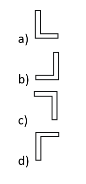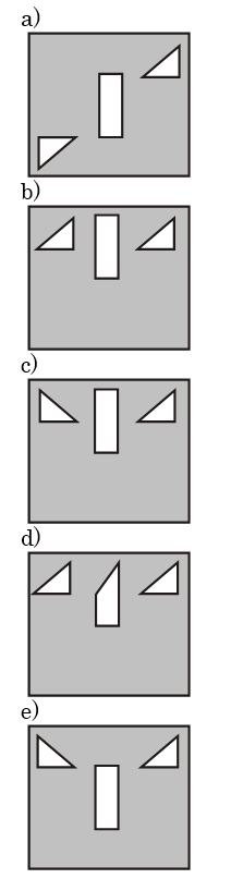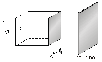 Do lado oposto ao orifício é colocado um espelho plano com sua face espelhada voltada para o anteparo translúcido da câmara e paralela a este, de forma que um observador em A possa visualizar a imagem do objeto estabelecida no anteparo pelo espelho. Nessas condições, a configuração que melhor representa a imagem vista pelo observador através do espelho é: