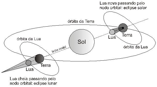 A condição para que ocorra um Eclipse é que haja um alinhamento total ou parcial entre Sol, Terra e Lua. A inclinação da órbita da Lua com relação ao equador da Terra provoca o fenômeno da Lua nascer em pontos diferentes no horizonte a cada dia.