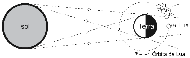 Abaixo vemos a Lua representada, na figura, nas posições 1, 2, 3 e 4, correspondentes a instantes diferentes de um eclipse.