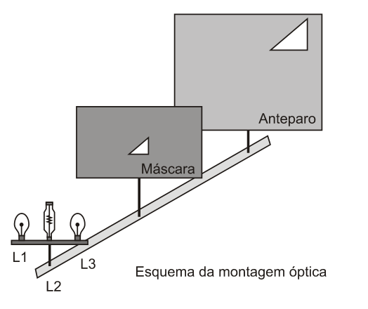 D (FUVEST 2010) Uma determinada montagem óptica é composta por um anteparo, uma máscara com furo triangular e três lâmpadas, L1, L2 e L3, conforme a figura a seguir. L1 e L3 são pequenas lâmpadas de lanterna e L2, uma lâmpada com filamento extenso e linear, mas pequena nas outras dimensões. No esquema, apresenta-se a imagem projetada no anteparo com apenas L1 acesa.