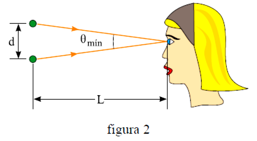 De forma grosseira podemos dizer que a pintura consiste de uma enorme quantidade de pontos de cores puras, bem próximos uns dos outros, tal que a composição adequada dos pontos causa a sensação de vibração e efeitos de luz e sombra impressionantes. Alguns pontos individuais podem ser notados se chegarmos próximo ao quadro. Isso ocorre porque a resolução angular do olho humano é θ mín ≅ 3,3 × 10–4 rad. A figura 2 indica a configuração geométrica para que uma pessoa perceba a separação d entre dois pontos vizinhos à distância L ≅ 30 cm do quadro.