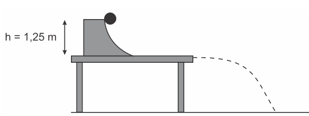 B (CFTMG 2016) A figura abaixo exibe uma bola que é abandonada de uma rampa curva de 1,25 m de altura que está sobre uma mesa nas proximidades da Terra. Após liberada, a bola desce pela rampa, passa pelo plano horizontal da mesa e toca o solo 1,00 s após passar pela borda.