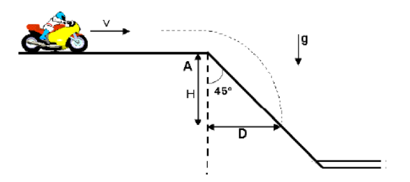 A (FUVEST 2001) Um motociclista de motocross move-se com velocidade v = 10 m/s, sobre uma superfície plana, até atingir uma rampa (em A), inclinada de 45° com a horizontal, como indicado na figura.