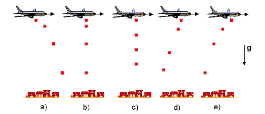 B (FUVEST 2002) Em decorrência de fortes chuvas, uma cidade do interior paulista ficou isolada. Um avião sobrevoou a cidade, com velocidade horizontal constante, largando 4 pacotes de alimentos, em intervalos de tempos iguais. No caso ideal, em que a resistência do ar pode ser desprezada, a figura que melhor poderia representar as posições aproximadas do avião e dos pacotes, em um mesmo instante, é: