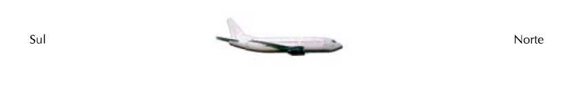 A (UERJ 2009) Um avião sobrevoa, com velocidade constante, uma área devastada, no sentido sul-norte, em relação a um determinado observador. A figura a seguir ilustra como esse observador, em repouso, no solo, vê o avião.