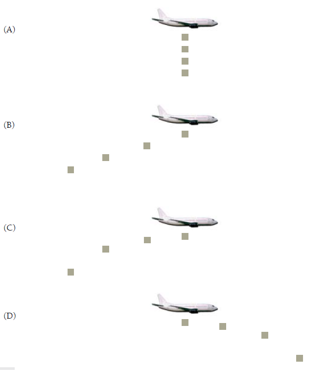 Quatro pequenas caixas idênticas de remédios são largadas de um compartimento da base do avião, uma a uma, a pequenos intervalos regulares. Nessas circunstâncias, os efeitos do ar praticamente não interferem no movimento das caixas. O observador tira uma fotografia, logo após o início da queda da quarta caixa e antes de a primeira atingir o solo. A ilustração mais adequada dessa fotografia é apresentada em: