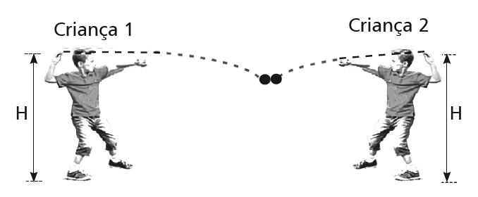 B (CEFET MG 2018) João observa duas esferas idênticas, lançadas horizontalmente por duas crianças 1 e 2 de uma mesma altura H, interceptarem-se antes de tocarem o chão, como mostra a figura abaixo.