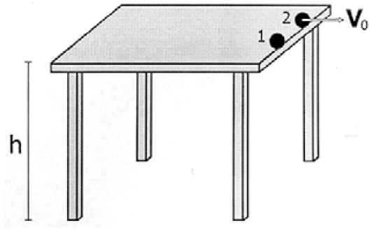 A (UFRGS 2018) Dois objetos de massas m1 e m2 (=2m1) encontram-se na borda de uma mesa de altura h em relação ao solo, conforme representa a figura abaixo.