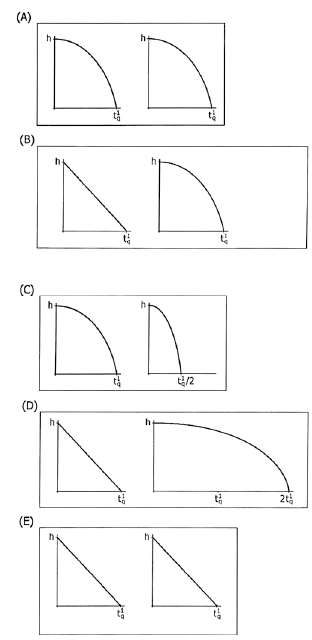 Assinale a alternativa que melhor representa os gráficos de posição vertical dos objetos 1 e 2, em função do tempo. Nos gráficos, t1q representa o tempo de queda do objeto 1. Em cada alternativa, o gráfico da esquerda representa o objeto 1 e o da direita representa o objeto 2.