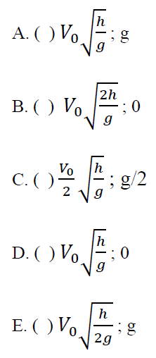 A (UDESC 2017) Um projétil é lançado, com velocidade horizontal Vo, do topo de uma mesa que possui altura h. Desconsiderando a resistência do ar, assinale a alternativa que corresponde ao deslocamento horizontal e ao módulo da aceleração deste projétil, respectivamente, quando ele está na metade da altura da mesa.