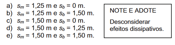 E (FUVEST 2011) Uma menina, segurando uma bola de tênis, corre com velocidade constante, de módulo igual a 10,8 km/h, em trajetória retilínea, numa quadra plana e horizontal. Num certo instante, a menina, com o braço esticado horizontalmente ao lado do corpo, sem alterar o seu estado de movimento, solta a bola, que leva 0,5 s para atingir o solo. As distâncias sm e sb percorridas, respectivamente, pela menina e pela bola, na direção horizontal, entre o instante em que a menina soltou a bola (t= 0 s) e o instante t= 0,5 s, valem: