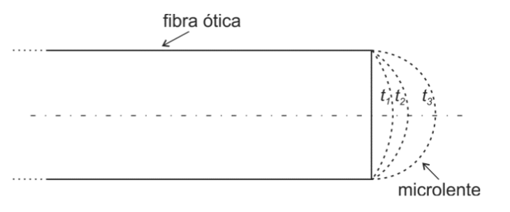 E (FUVEST 2013) A extremidade de uma fibra ótica adquire o formato arredondado de uma microlente ao ser aquecida por um laser, acima da temperatura de fusão. A figura abaixo ilustra o formato da microlente para tempos de aquecimento crescentes (t1 < t2 < t3).