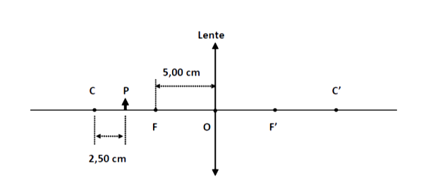C (UFES 2011) Em uma experiência de laboratório, um objeto real foi colocado a 10,0 cm de uma lente delgada convergente. Sabendo-se que a distância focal da lente é igual a 20,0 cm, a imagem formada será: