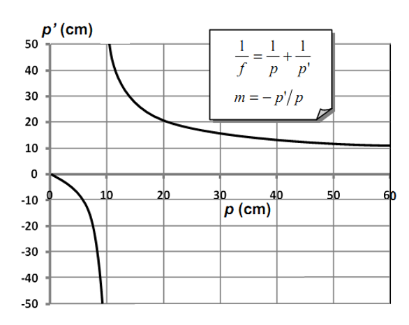 D (PUC PR 2011) A equação de Gauss relaciona a distância focal (f) de uma lente esférica delgada com as distâncias do objeto (p) e da imagem (p’) ao vértice da lente. O gráfico dado mostra a distância da imagem em função da distância do objeto para uma determinada lente. Aproximadamente, a que distância (p) da lente deve ficar o objeto para produzir uma imagem virtual, direita e com ampliação (m) de 4,0 vezes?