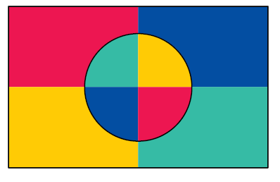 C (UNESP 2018) A figura representa um painel colorido e a imagem de parte desse painel, observada através de uma lente convergente, colocada paralelamente à sua frente. Considerando que o círculo representa a lente, cuja distância focal é igual a F, a distância entre o centro óptico da lente e o painel é