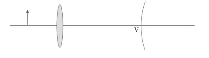 B (UDESC 2018) Um objeto é colocado a 4,0 cm à esquerda de uma lente convergente de distância focal de 2,0 cm. Um espelho convexo de raio de curvatura de 4,0cm está 10,0cm à direita da lente convergente, como mostra a figura.