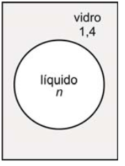 B (FUVEST 2011) Um objeto decorativo consiste de um bloco de vidro transparente, de índice de refração igual a 1,4, com a forma de um paralelepípedo, que tem, em seu interior, uma bolha, aproximadamente esférica, preenchida com um líquido, também transparente, de índice de refração n. A figura a seguir mostra um perfil do objeto.