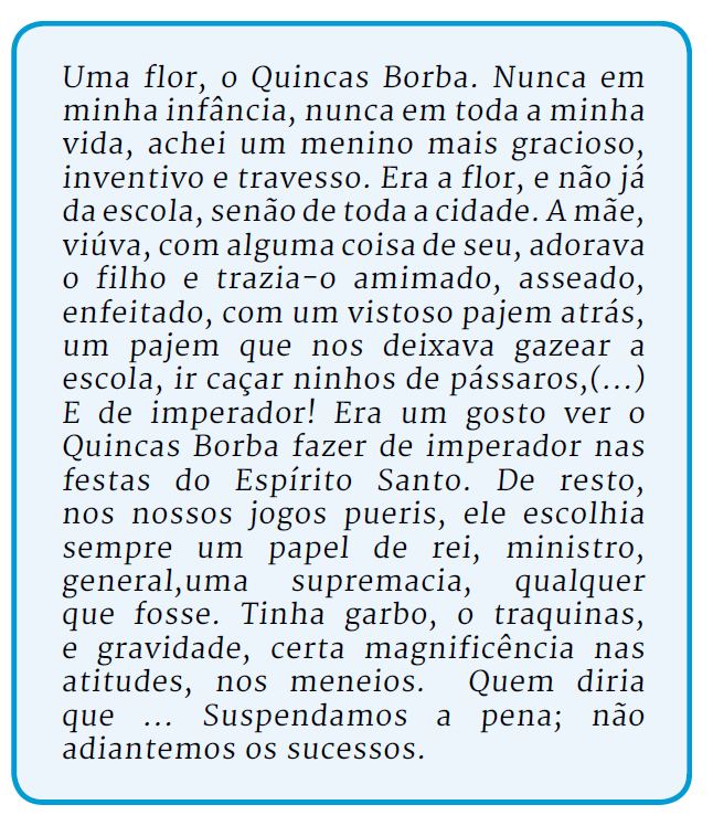 O trecho citado diz respeito ao encontro entre Brás Cubas e Quincas Borba, no capítulo 49, e, mais precisamente, apanha o momento em que Brás dá uma esmola ao amigo.