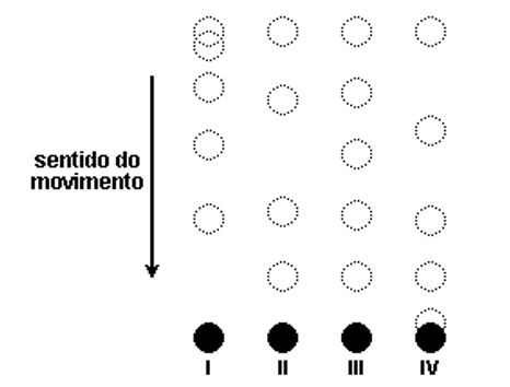 C (CFTMG 2006) As figuras a seguir representam as posições sucessivas, em intervalos de tempo iguais, e fixos, dos objetos I, II, III e IV em movimento.