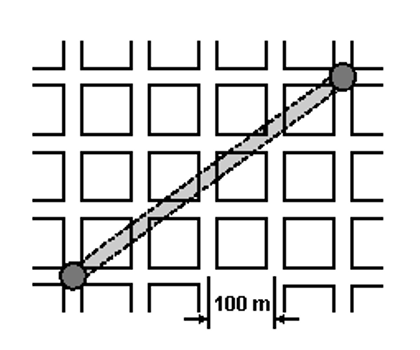 (UNICAMP 2004) Os carros em uma cidade grande desenvolvem uma velocidade média de 18 km/h, em horários de pico, enquanto a velocidade média do metrô é de 36 km/h. O mapa adiante representa os quarteirões de uma cidade e a linha subterrânea do metrô.