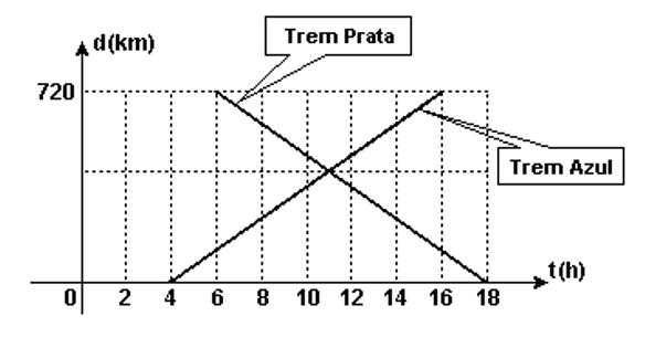 (UFSC 2004) Dois trens partem, em horários diferentes, de duas cidades situadas nas extremidades de uma ferrovia, deslocando-se em sentidos contrários. O trem Azul parte da cidade A com destino à cidade B, e o trem Prata da cidade B com destino à cidade A. O gráfico representa as posições dos dois trens em função do horário, tendo como origem a cidade A (d = 0).