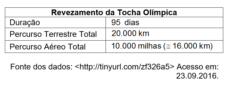 B (FATEC 2017) A tabela apresenta dados extraídos diretamente de um texto divulgado na internet pelo Comitê Organizador da Rio 2016, referente ao revezamento da Tocha Olímpica em território brasileiro, por ocasião da realização dos XXXI Jogos Olímpicos Modernos no Rio de Janeiro.