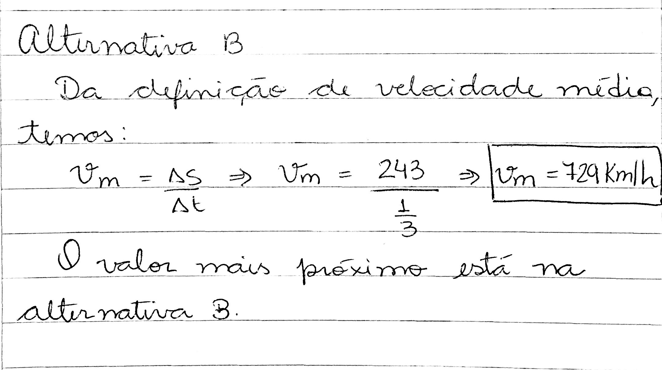 B (ACAFE 2008-1) Recentemente, o Brasil reativou o seu programa espacial, que culminou com o lançamento bem-sucedido do foguete VSB-30, da base de Alcântara, no Maranhão. Esse foguete levava, em seu interior, para ambiente de microgravidade, nove experiências de pesquisadores brasileiros e alemães. A Universidade Federal de Santa Catarina também participou desse projeto. Levando em consideração que esse vôo durou em torno de 20 minutos e que a altitude de alcance foi de 243 km, a velocidade média aproximada desse foguete, desprezando a resistência do ar, foi de: