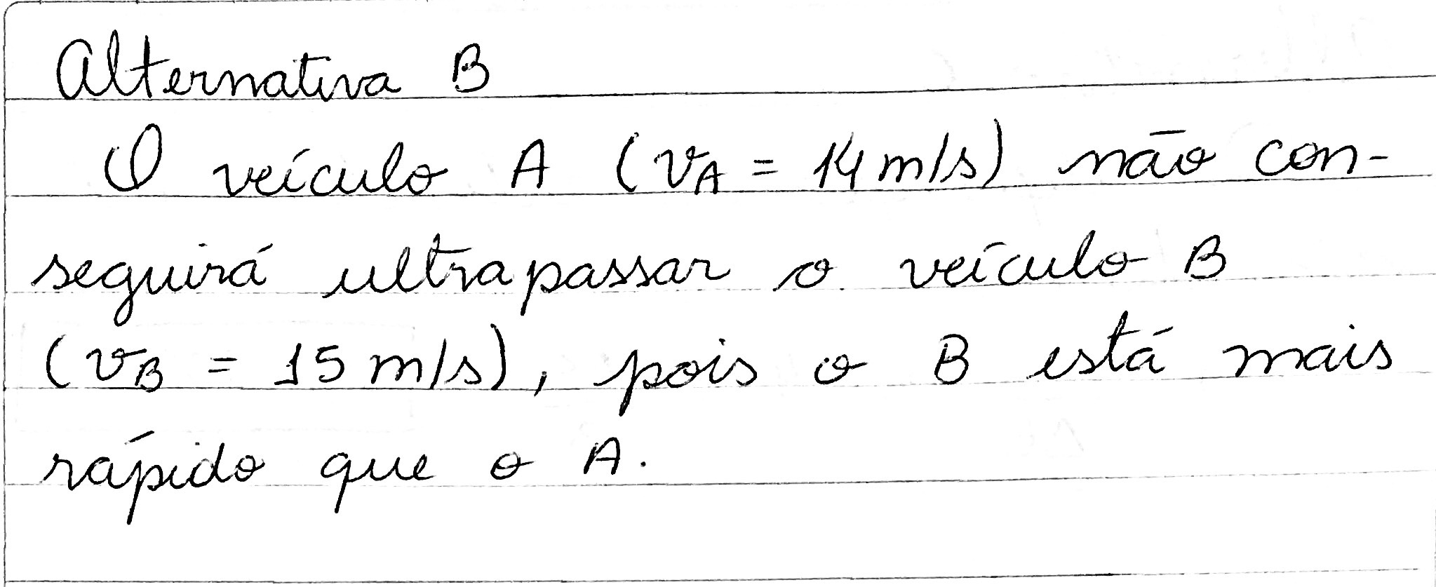 - b) mantidas essas velocidades, A não conseguirá ultrapassar B.