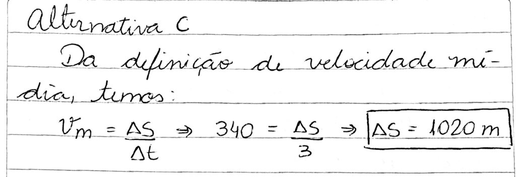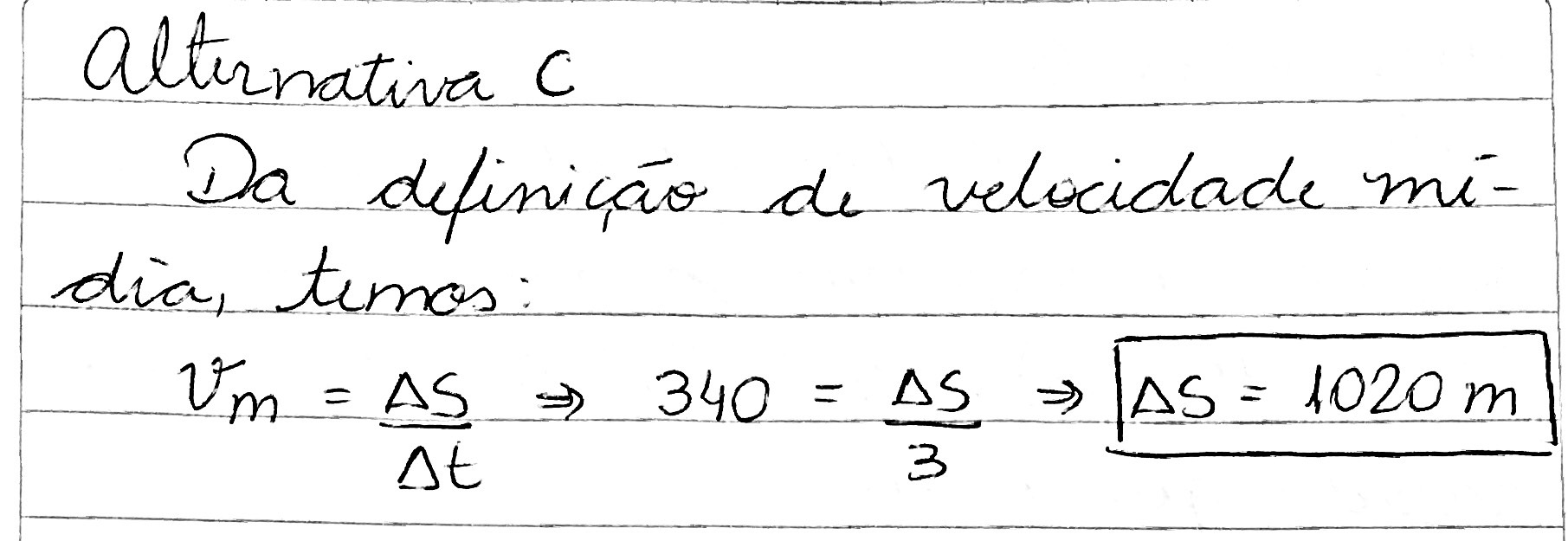C (PUC RJ 2010) O tempo entre observarmos um raio e escutarmos o som emitido por ele pode ser utilizado para determinar a distância entre o observador e a posição onde “caiu” o raio. Se levarmos 3 s para escutar o relâmpago é correto afirmar que o raio caiu a: (Considere a velocidade do som no ar como 340 m/s)