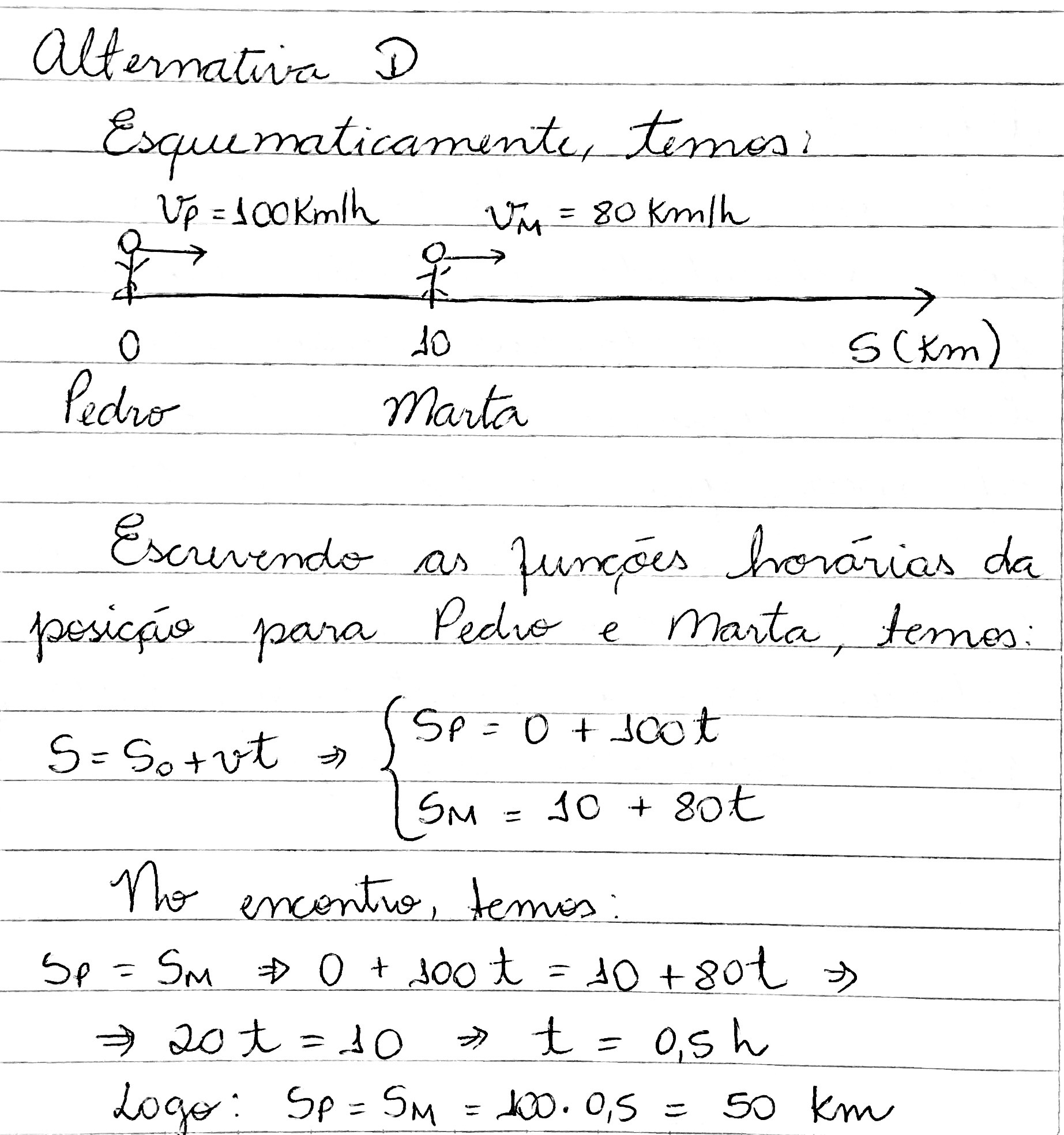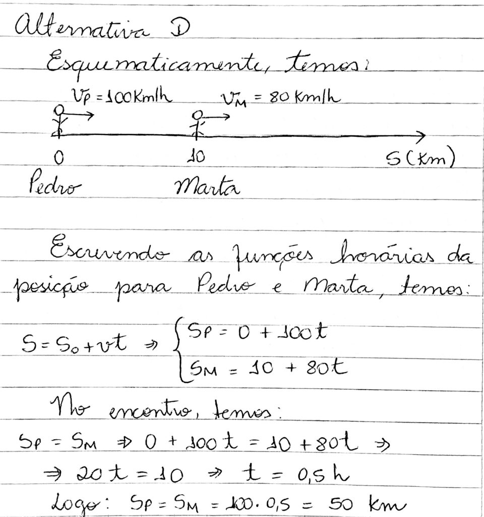 D (FUVEST 2009) Marta e Pedro combinaram encontrar-se em certo ponto de uma autoestrada plana, para seguirem viagem juntos. Marta, ao passar pelo marco zero da estrada, constatou que, mantendo uma velocidade média de 80 km/h, chegaria na hora certa ao ponto de encontro combinado. No entanto, quando ela já estava no marco do quilômetro 10, ficou sabendo que Pedro tinha se atrasado e, só então, estava passando pelo marco zero, pretendendo continuar sua viagem a uma velocidade média de 100 km/h. Mantendo essas velocidades, seria previsível que os dois amigos se encontrassem próximos a um marco da estrada com indicação de
