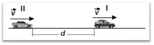 Considere que: os dois veículos estão a 72 km/h (20 m/s); o motorista do veículo I acionou os freios quando o veiculo II se encontrava a uma distância d; e, durante a frenagem, os veículos percorrem a mesma distância. Nessa situação, é correto afirmar: