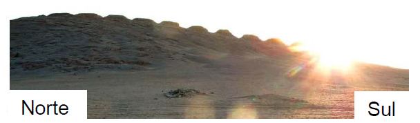 B (UNICAMP 2018) Situado na costa peruana, Chankillo, o mais antigo observatório das Américas, é composto por treze torres que se alinham de norte a sul ao longo de uma colina. Em 21 de dezembro, quando ocorre o solstício de verão no Hemisfério Sul, o Sol nasce à direita da primeira torre (sul), na extrema direita, a partir de um ponto de observação definido. À medida que os dias passam, a posição em que o Sol nasce se desloca entre as torres rumo à esquerda (norte). Pode-se calcular o dia do ano, observando-se qual torre coincide com a posição do Sol ao amanhecer. Em 21 de junho, solstício de inverno no Hemisfério Sul, o Sol nasce à esquerda da última torre na extrema esquerda e, à medida que os dias passam, vai se