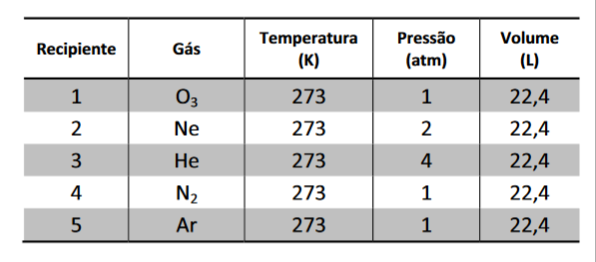 C (FUVEST 2014) A tabela abaixo apresenta informações sobre cinco gases contidos em recipientes separados e selados.