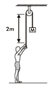 C (PUC SP 2012-1) Um homem mantém em equilíbrio estático um bloco preso a uma corda de densidade linear igual a 0,01kg/m, conforme a figura. Determine a massa M do bloco, sabendo que as frequências de duas harmônicas consecutivas de uma onda estacionária no trecho vertical de 2 m da corda correspondem a 150 Hz e 175 Hz.