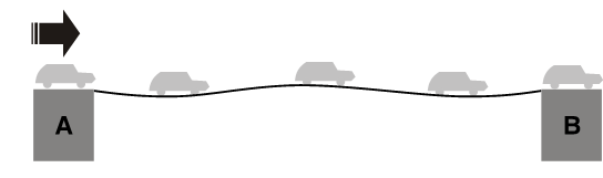B (UFPR 2011) Uma fila de carros, igualmente espaçados, de tamanhos e massas iguais faz a travessia de uma ponte com velocidades iguais e constantes, conforme mostra a figura abaixo. Cada vez que um carro entra na ponte, o impacto de seu peso provoca nela uma perturbação em forma de um pulso de onda. Esse pulso se propaga com velocidade de módulo 10 m/s no sentido de A para B. Como resultado, a ponte oscila, formando uma onda estacionária com 3 ventres e 4 nós.