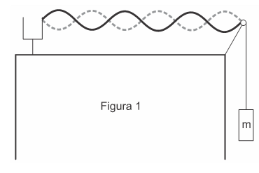 C (EFOMM 2017) Uma corda ideal está atada a um diapasão que vibra com frequência f1 e presa a um corpo de massa m = 2,5 kg conforme a figura 1. A onda estacionária que se forma possui 6 ventres que formam 3,0 m de comprimento.