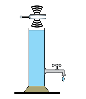 C (FCMSCSP 2019) Um tubo cilíndrico está totalmente cheio de água e tem uma torneira fechada em sua parte inferior. Quando a torneira é aberta, a água escoa, fazendo com que seu nível, dentro do cilindro, abaixe com uma velocidade constante de 1 cm/s. Um diapasão de frequência 440 Hz é colocado para vibrar próximo à extremidade superior do cilindro e a torneira é aberta.