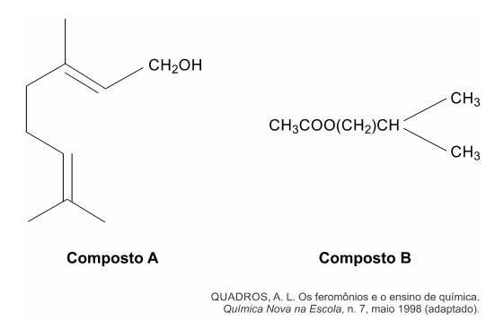 A (ENEM 2015) Uma forma de organização de um sistema biológico é a presença de sinais diversos utilizados pelos indivíduos para se comunicarem. No caso das abelhas da espécie Apis mellifera, os sinais utilizados podem ser feromônios. Para saírem e voltarem de suas colmeias, usam um feromônio que indica a trilha percorrida por elas (Composto A). Quando pressentem o perigo, expelem um feromônio de alarme (Composto B), que serve de sinal para um combate coletivo. O que diferencia cada um desses sinais utilizados pelas abelhas são as estruturas e funções orgânicas dos feromônios.