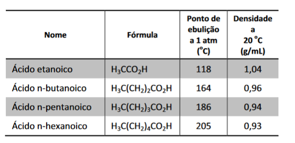 - a) A 20 ºC, 1 mL de ácido etanoico tem massa maior do que 1 mL de ácido n-pentanoico.