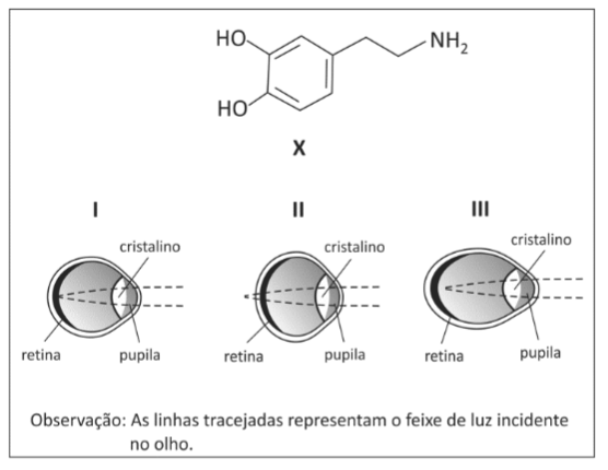 E (FUVEST 2014) Estudos recentes parecem indicar que o formato do olho humano e a visão são influenciados pela quantidade da substância X, sintetizada pelo organismo. A produção dessa substância é favorecida pela luz solar, e crianças que fazem poucas atividades ao ar livre tendem a desenvolver dificuldade para enxergar objetos distantes. Essa disfunção ocular é comumente chamada de miopia. Considere a fórmula estrutural da substância X e os diferentes formatos de olho: