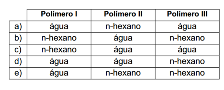 Para remover os resíduos de polímero das peças, o funcionário dispunha de apenas dois solventes: água e n-hexano. O funcionário analisou as fórmulas estruturais dos três polímeros e procurou fazer a correspondência entre cada polímero e o solvente mais adequado para solubilizá-lo. A alternativa que representa corretamente essa correspondência é: