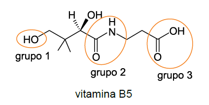 Em relação à afinidade da vitamina B5 com a água e ao caráter ácido que os grupos circulados na estrutura conferem ao composto, é correto afirmar que a vitamina B5 é