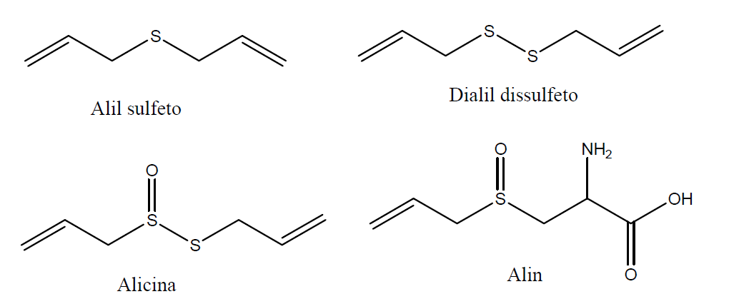 D (UFJF – PISM 2 2010) O alho é utilizado desde a antiguidade como remédio devido às suas propriedades antimicrobianas e aos seus efeitos benéficos para o coração. Além disso, o alho possui um ótimo valor nutricional, contendo vitaminas, aminoácidos, sais minerais e compostos biologicamente ativos, como a alicina. Alguns dos constituintes do alho são mostrados a seguir: