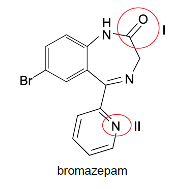 Na estrutura do bromazepam, o grupo I e a função orgânica II correspondem, respectivamente, a