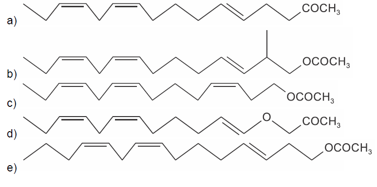 Uma indústria agroquímica necessita sintetizar um derivado com maior eficácia. Para tanto, o potencial substituto deverá preservar as seguintes propriedades estruturais do feromônio sexual: função orgânica, cadeia normal e isomeria geométrica original.