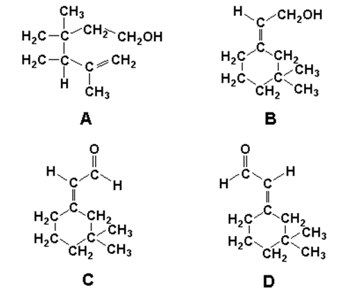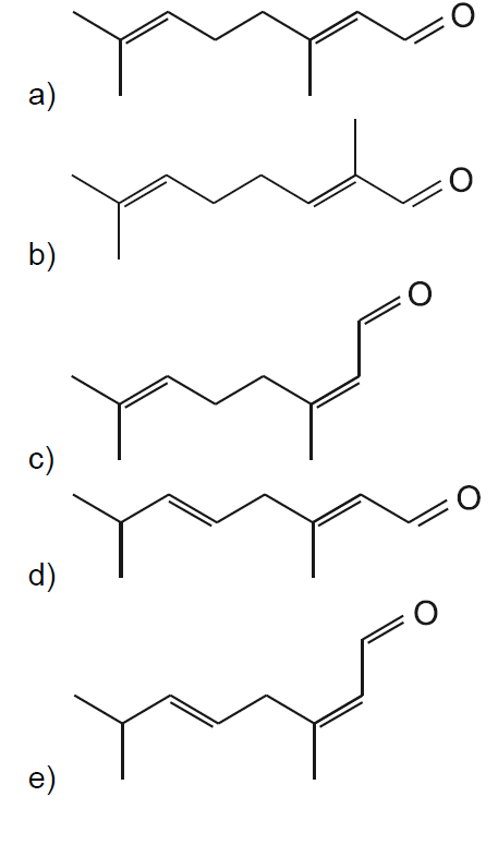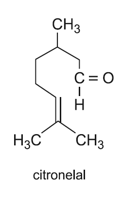 A (ENEM 2013) O citral, substância de odor fortemente cítrico, é obtido a partir de algumas plantas como o capim-limão, cujo óleo essencial possui aproximadamente 80%, em massa, da substância. Uma de suas aplicações é na fabricação de produtos que atraem abelhas, especialmente do gênero Apis, pois seu cheiro é semelhante a um dos feromônios liberados por elas. Sua fórmula molecular é C10H16O, com uma cadeia alifática de oito carbonos, duas insaturações, nos carbonos 2 e 6; e dois grupos substituintes metila, nos carbonos 3 e 7. O citral possui dois isômeros geométricos, sendo o trans o que mais contribui para o forte odor.