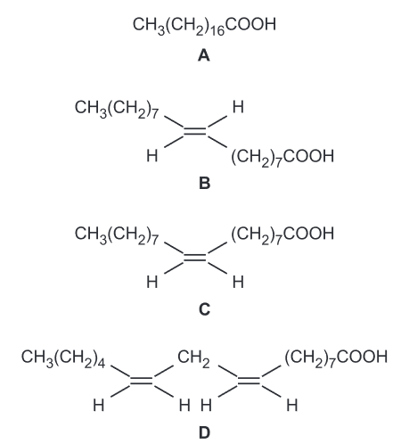 D (ENEM cancelado 2009) Sabe-se que a ingestão frequente de lipídios contendo ácidos graxos (ácidos monocarboxílicos alifáticos) de cadeia carbônica insaturada com isomeria trans apresenta maior risco para o desenvolvimento de doenças cardiovasculares, sendo que isso não se observa com os isômeros cis.