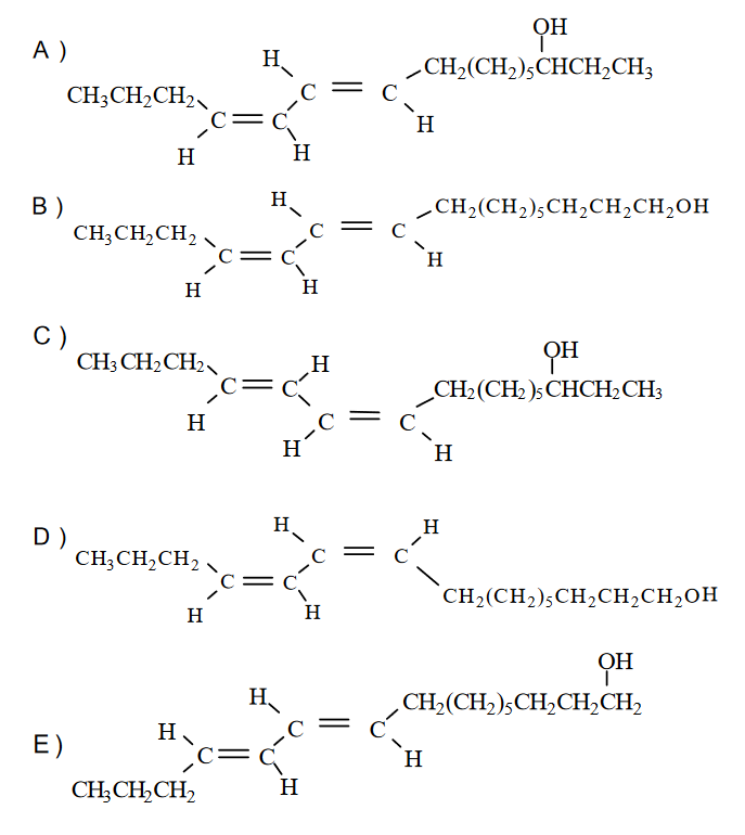 B (UFPE 1998) O bicho da seda libera um composto chamado bombicol para se comunicar com outros indivíduos de sua espécie. O bombicol é um álcool primário de cadeia muito longa contendo duas ligações dupla, uma cis e outra trans na cadeia de carbono. Nenhum de seus vários isômeros tem efeito no processo de comunicação entre esses insetos. Qual das estruturas abaixo representa o bombicol?